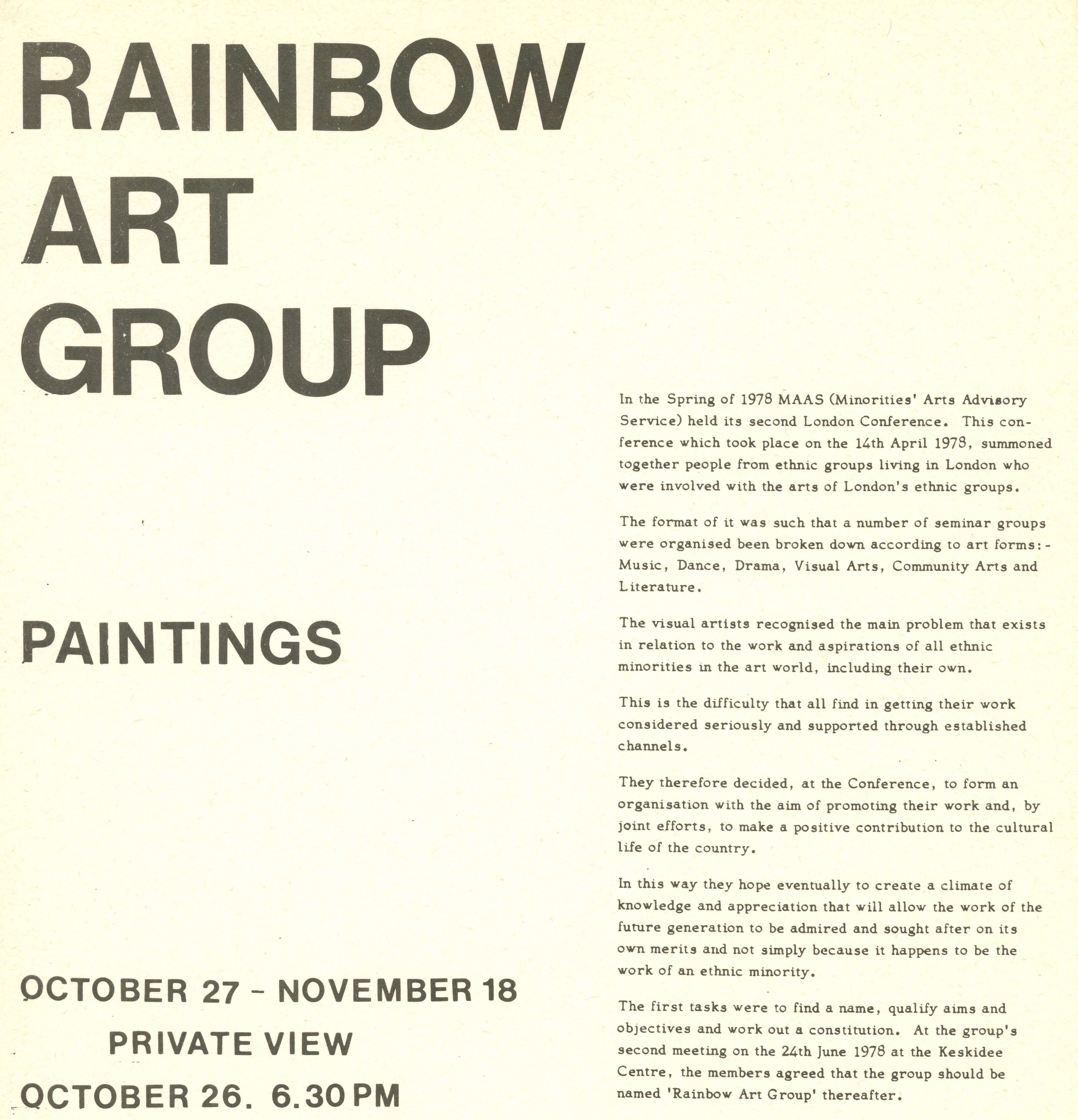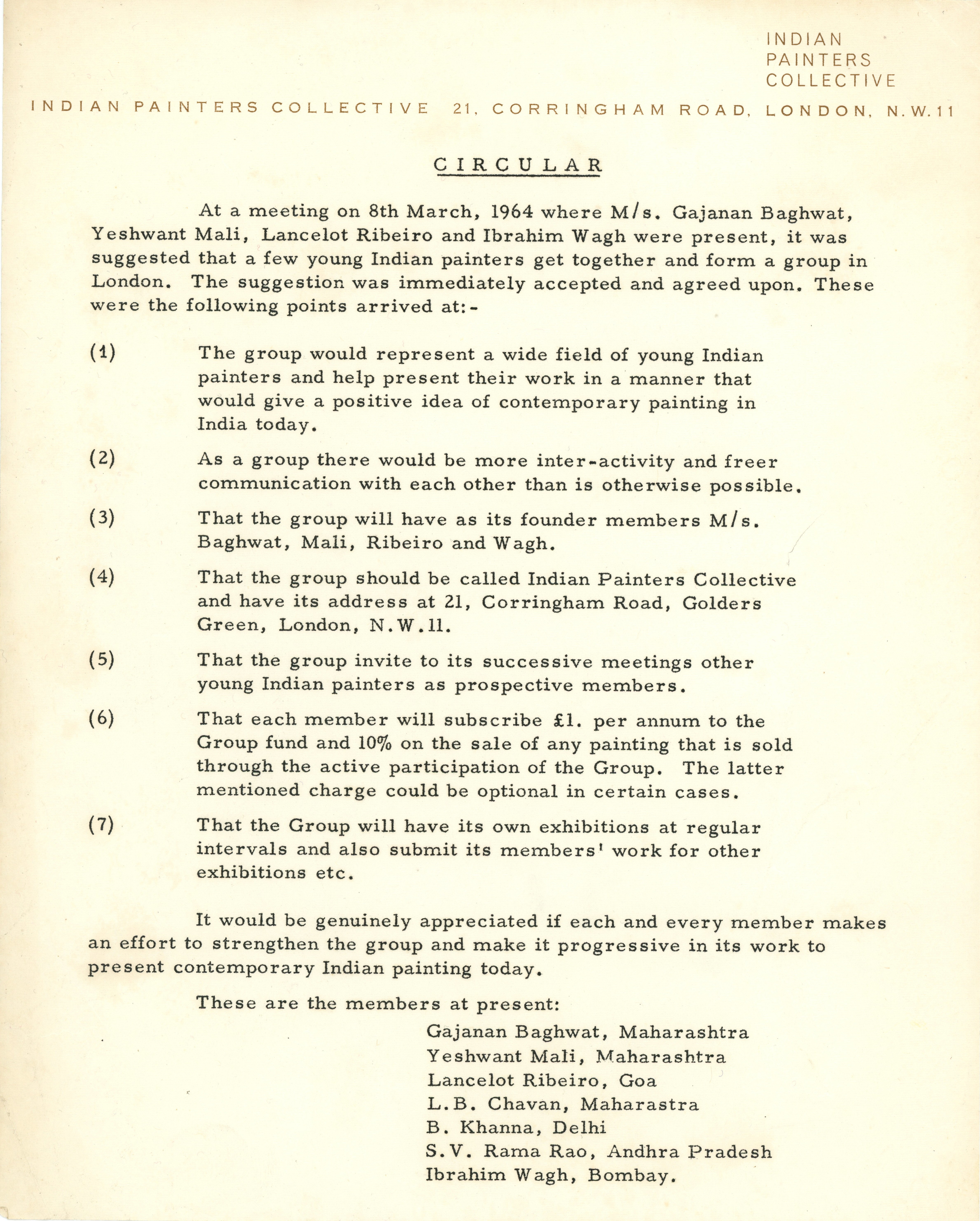 Ana Rita Pinto Correia follows Ribeiro to England. Founder member of the Indian Painters Collective (IPC), UK with Gajanan D Bhagwat, Yashwant Mali, and Ibrahim Wagh, all Indian painters living in the UK - the collective is later expanding to seven members with the addition of L. B. Chavan, Balraj Khanna, S. V. Rama Rao.